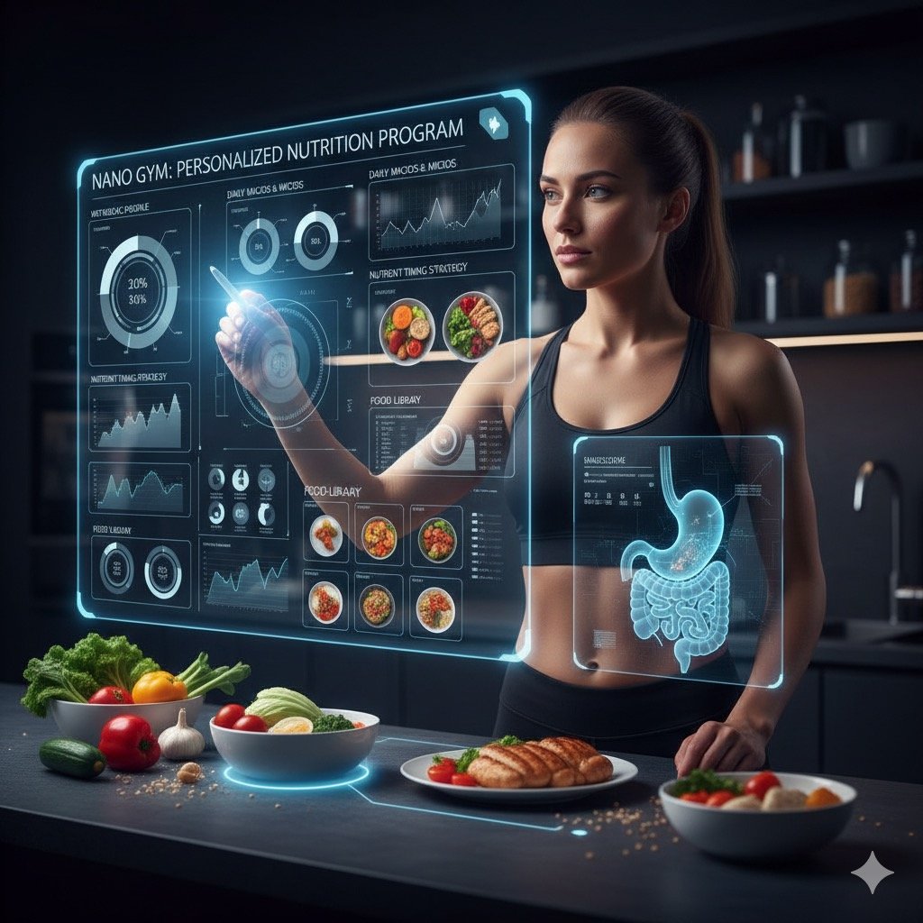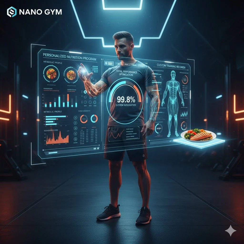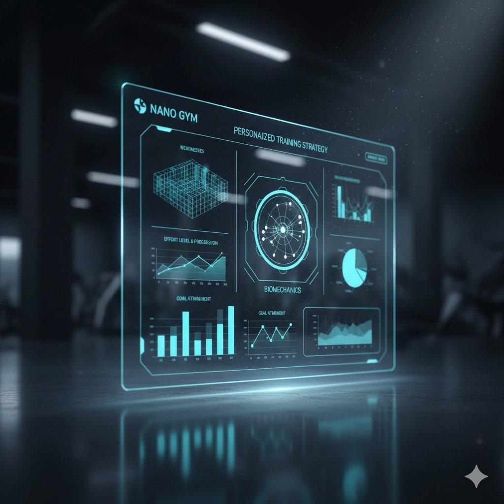 Futuristic holographic display showing data and charts for 'Nano Gym' with sections for weaknesses, effort level, biomechanics, and progress graphs.