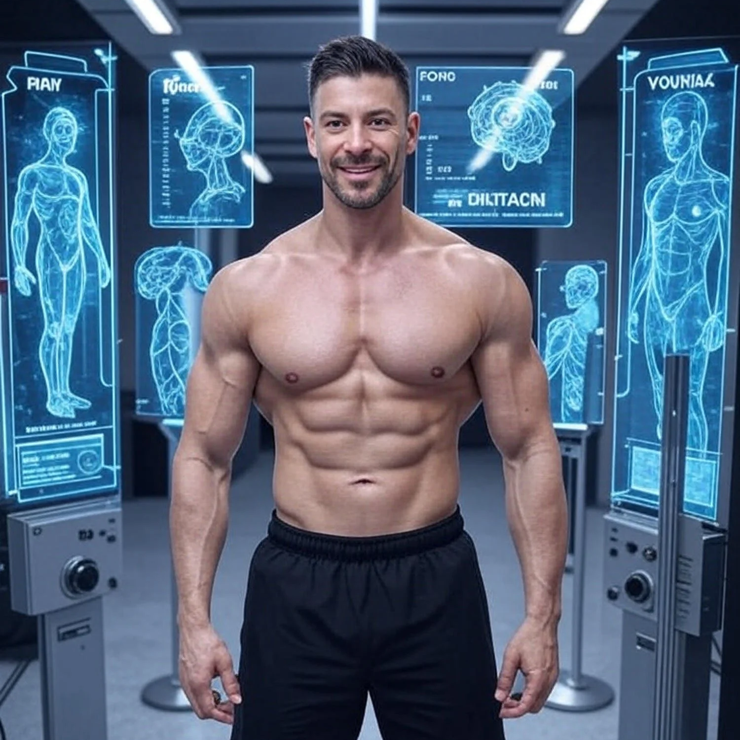 A shirtless man with a muscular build smiling in front of futuristic digital health display screens showing human anatomy and brain scans.